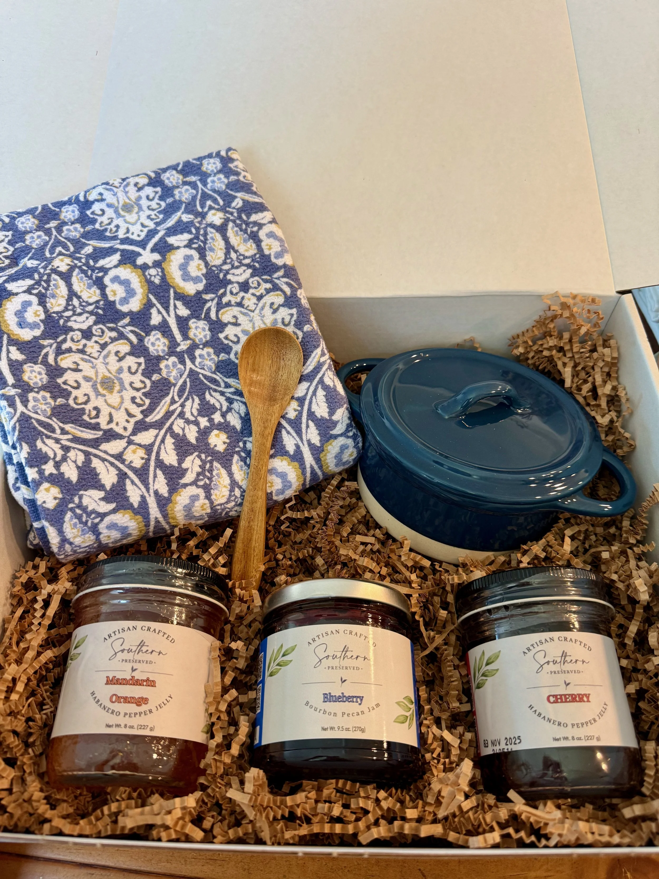 Celebrate the essence of Southern craftsmanship with our Blueberry Artisan Collection. This thoughtfully curated set showcases our bestselling Blueberry Bourbon Pecan Jam alongside our signature Habanero Pepper Jelly - each handcrafted in small batches with premium ingredients. Complete with a stunning blue ceramic cocotte, wooden spoon, and elegant patterned napkin, this collection brings artisanal elegance to any kitchen. We've included our treasured Blueberry Pie Bars recipe to inspire your baking adventures. Beautifully packaged and ready to gift, it's perfect for those who appreciate authentic Southern flavors and the art of handcrafted specialty foods.